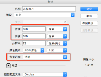 1、打开后点文件——新建——大小设置为 650px * 650px。背景内容 选:透明,点确定。