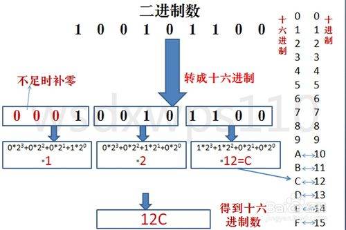 2、二进制转换成十六进制:将一个二进制数从右到左每四位分成一组,如果最左边剩余的数字不够四位,那么用零补足成一组,找出每组二进制数所对应的十六进制数字。最后将十六进制数字从左到右依次写出的一个数即为十六进制数。