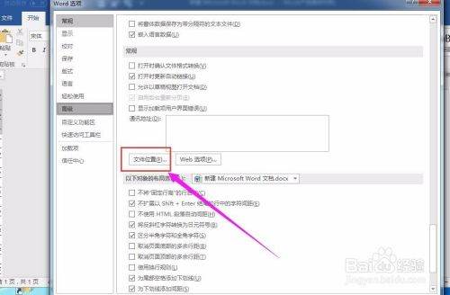 在弹出的WORD选项对话框中,点击“高级”,下拉找到“常规”,点击文件位置。