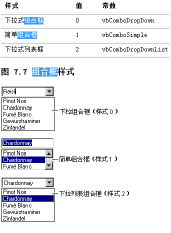 此处有三种组合框样式。每种样式都可在设计时或运行时来设置,而且每种样式都使用数值或相应的 Visual Basic
