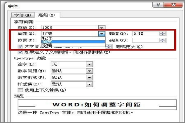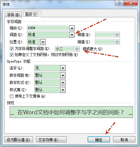 在Word中,设置字符间距就是保持字符的高度不变,将宽度增大或减少一定的比例。