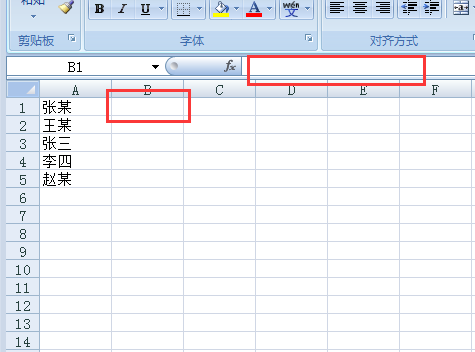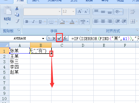 一、如下图的表格中A列有几个名字,这时要在B列中查找A列单元格中是否包含“某”这个字,如果有,则返还“有”,如果无,则返还“无”,这时点击B1单元格,然后点击公式栏。