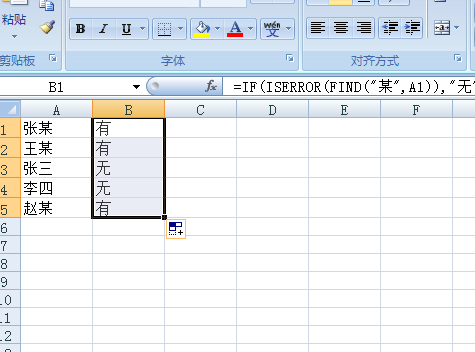 四、最终效果如下图,这时在B列中能够检测出A列单元格是否包含“某”这个字(注意,公式中的“有”和“无”二字可以更换成自己所需的文字或特定符号,但注意保留双引号)。