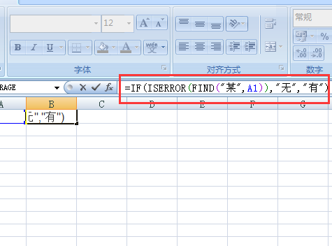 二、在B1单元格的公式栏中输入公式=IF(ISERROR(FIND("某",A1)),"无","有") 。