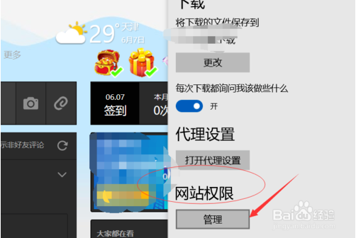 点击进入浏览器的高级设置中,然后点击图示位置中的 网站权限,然后在权限下方点击 管理 ,如图所示,进入权限管理页面中。