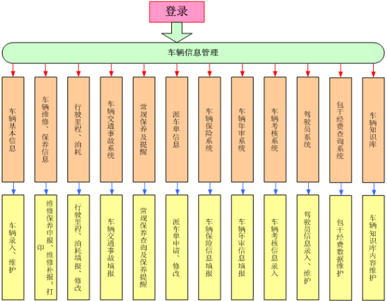 公车管理系统分为:车辆档案管理、派车用车管理、车辆定位轨迹管理、车辆加油管理、车辆费用管理、车辆保养保险管理、车辆使用统计等。
