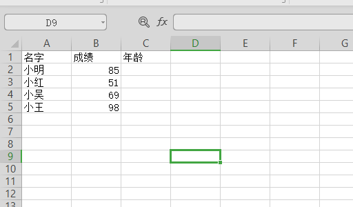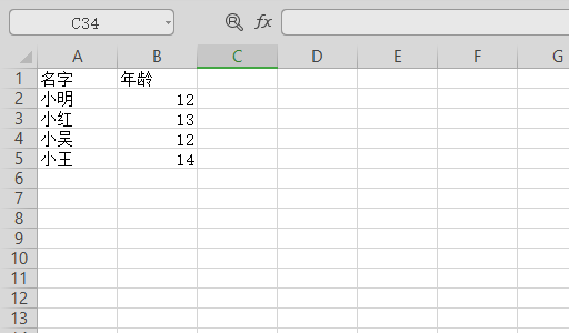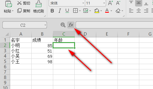 3、打开表格之后,点击选择年龄底下的第一个单元格,然后点击插入函数。