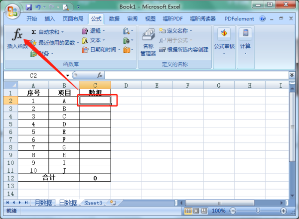 3、点击输入数据的首行单元格,选择插入函数
