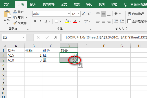 3、在表2”d2“单元格,输入公式”=LOOKUP(1,0/((Sheet1!$A$2:$A$101=$A2)*(Sheet1!$C$2:$C$101=$C2)),Sheet1!D$2:D$101)“。