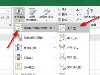2、选择要突出显示的数据,找到条件格式-突出显示单元格规则-大于。