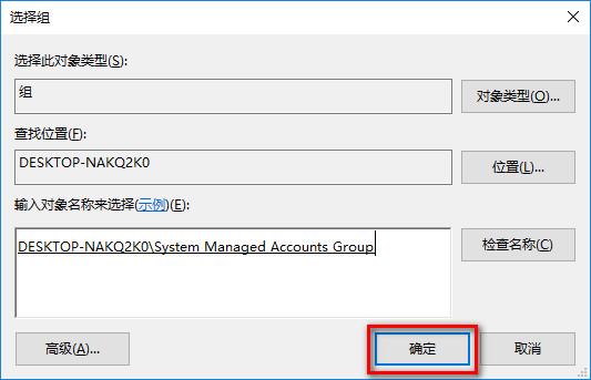 在(输入对象名称)方框中输入“System Managed Accounts Group”,再点击“检查名称。