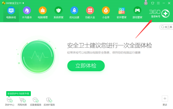 1、打开360安全卫士,先在主界面的右上方登录账号;