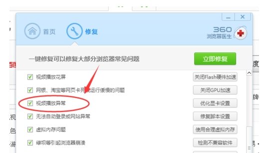 2、然后根据自己的问题情况选择修复的内容,比如笔者的是视频播放问题,点击立即修复。不过,为了更好的解决问题,建议修复全部选项。