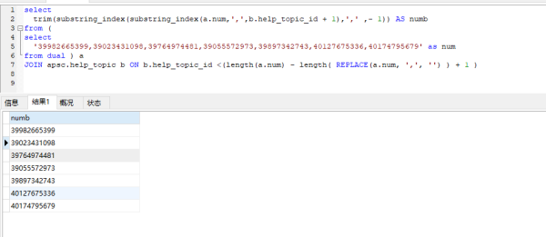 trim(substring_index(substring_index(a.num,',',b.help_topic_id+1),',',-1))ASnumb