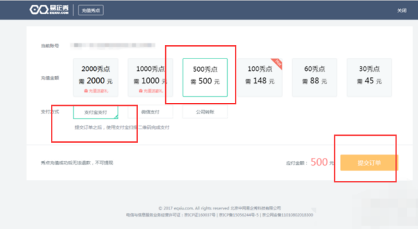 9、在这个界面中,选择一个要充值的选项,选择支付的方式,单击“提交订单”按钮,这样的作品就没有尾页了