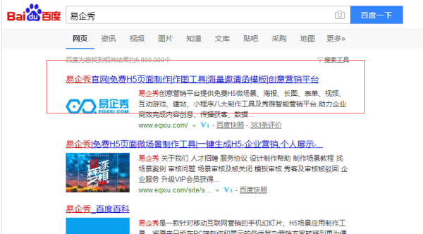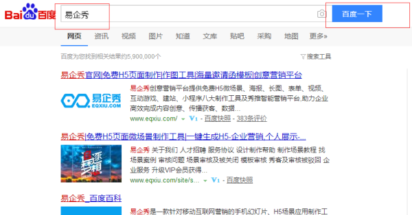 1、打开一个浏览器,输入“易企秀”,单击“百度一下”