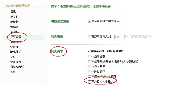在360界面菜单栏的“工具”中选择“360安全浏览器选项”–“网页设置”选项–在网页设置选项中取消“不支持Java小程序”。如下图所示,设置完成后,重新打开浏览器设置即可生效。