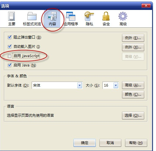 打开火狐浏览器界面,在菜单栏中选择“工具”–“选项”–“内容”中可见到“启用JavaScript”的选项,重新启动浏览器即可。