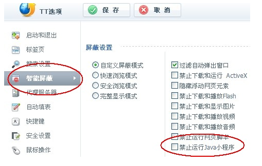 选择“TT选项”,在打开的设置界面中选择“智能屏蔽”,在智能屏蔽设置页面中将“禁止运行Java程序”取消,点击保存,重新启动浏览器设置即可生效。