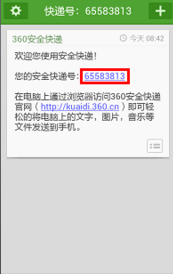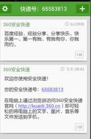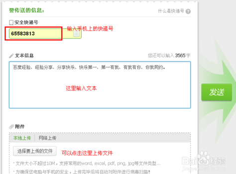 6,将手机用数据线连接电脑上,打开360安全浏览器,并打开360安全快递扩展项,可以看到操作界面,根据提示输入手机上显示的快递号,以及文本信息或传送的文件,然后点击发送按钮。
