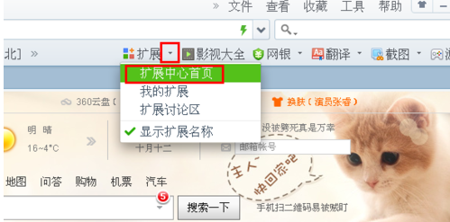 1,打开360安全浏览器主页,在菜单栏找到功能“扩展”项,点击后面的下拉箭头,选择扩展中心首页。