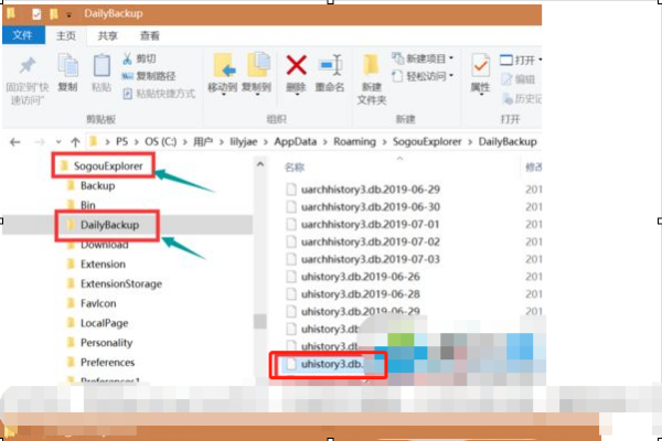 6、进入界面,左侧栏点击sogouexplorer/Dailybackup文件夹,在里面找到uhistroy3.db.日期,日期选择前一天的。鼠标点击这个文件,键盘按住CTRL+c;