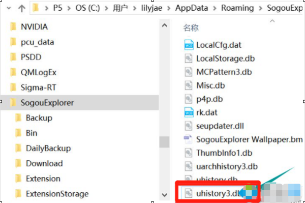 7、返回sogouexplorer文件夹,找到uhistroy3.db文件,点击将它删除。在空白处点击,键盘按住CTRL+v;
