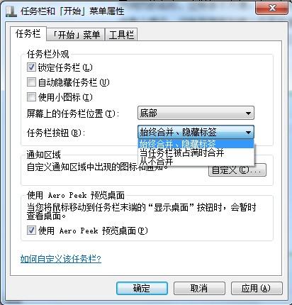 右键单击任务栏空白处,属性,“任务栏按钮”后面的选项选择“从不合并”。电脑IE浏览器为什么才打开四、五个任务栏就重叠了?怎么改成平铺在任务栏上的状态?