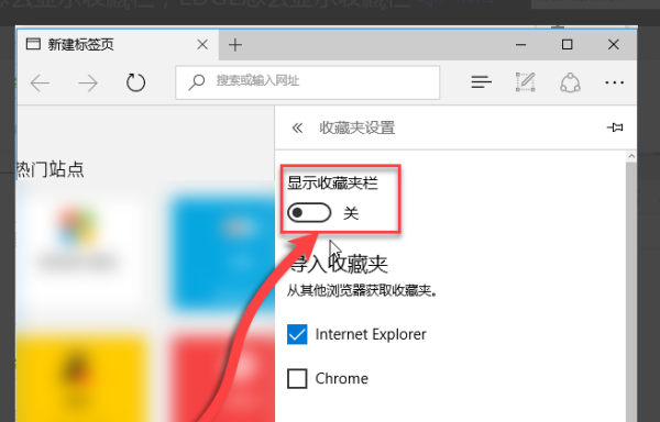 edge浏览器显示收藏夹栏方法: 方法1: 1.打开Edge浏览器,点击右上角的“...”。如图1所示 (图1) 2.找到“显示收藏夹栏”,显示就设为“开”,不显示就设为“关”。如图2所示 (图2)EDGE浏览器收藏夹能不能直接显示
