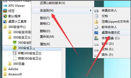 3、选中360安全卫士,右键单击,在弹出来的选项里面点击发送到桌面快捷方式。