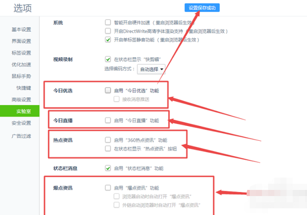 6、在打开的页面中将今日优选、今日直播、热点资讯、爆点资讯等选项前面框中的勾去掉并保存即可。