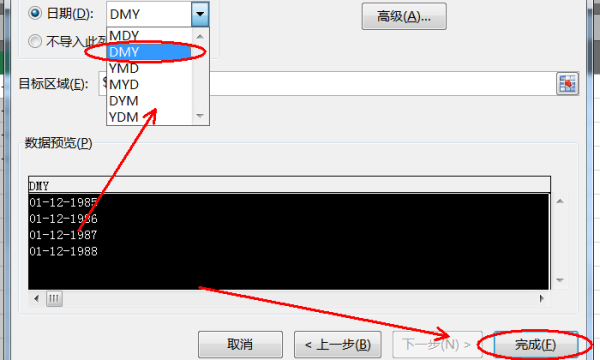 3、进入分列向导3,选择“日期”,并在后面选项框中选择“DMY”样式,然后点击“完成”。