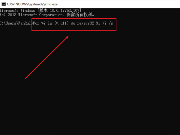 4丶继续输入:For %i in (*.dll) do regsvr32 %i /i /s,回车重启即可。