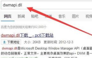 1、首先看提示信息中是缺少什么.dll文件,我们需要找到这个文件,比如是dwmapi.dll文件,那么我们就在百度里找。