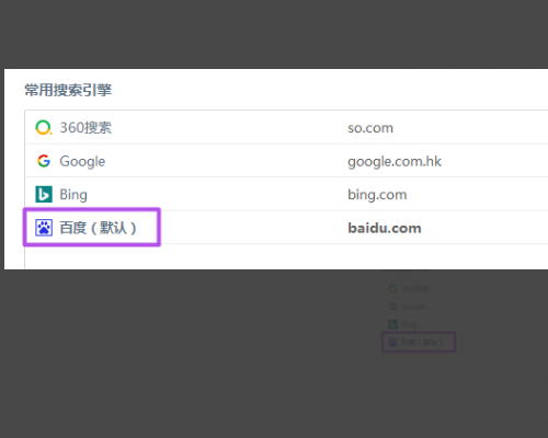 4、可以看到360浏览器有4中内置的搜素引擎,而且360搜索是默认的引擎,那么这时将百度改为默认搜素引擎。