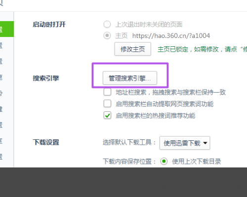 3、在选项的‘基本设置’中点击“管理搜索引擎”。