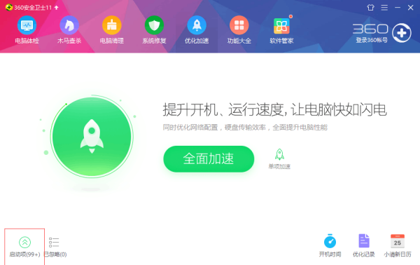 3然后就可以打开 ( 优化加速 ) 页面.左下角点开启动项
