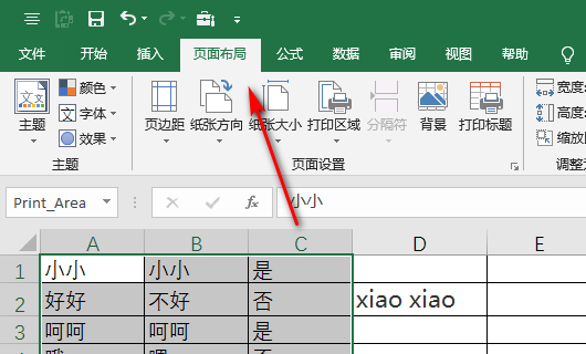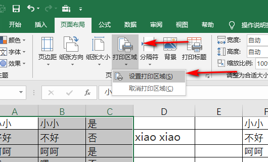 3、点击进入页面布局后,点击打印区域,然后点击设置打印区域,就可以把刚才选中的部分设置为打印区域。