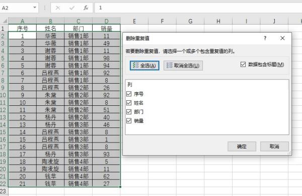 如果要删除某两列连接一起的重复值,就要勾选那两列