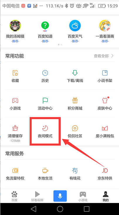 3、在手机百度我的界面,找到手机的日间模式,选择点击,即可完成操作。