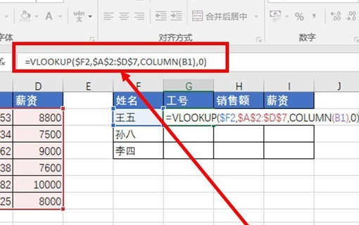 3、输入VLOOKUP函数【=VLOOKUP($F2,$A$2:$D$7,COLUMN(B1),0)】。函数的构成如下:首先,由于所有查找的参考值一样,全部为“姓名”,因此设置为绝对引用($F2)保持引用参考值不变。