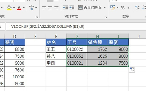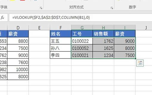 4、进行拖动复制函数,即可完成多列的查找返回。