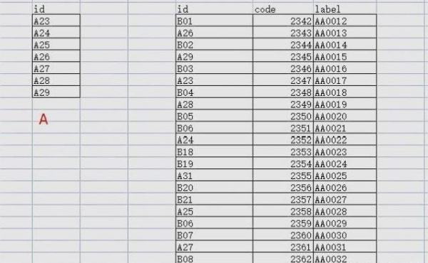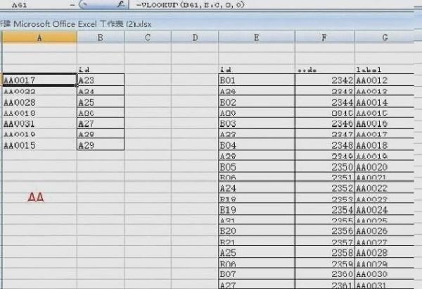 用vlookup函数在A表的左边找出label值构造出一个新的AA表。此时的函数为=VLOOKUP(B2,E:G,3,0),其中3表示返回待查表的第三列的值,即是label列的值,0表精确匹配。