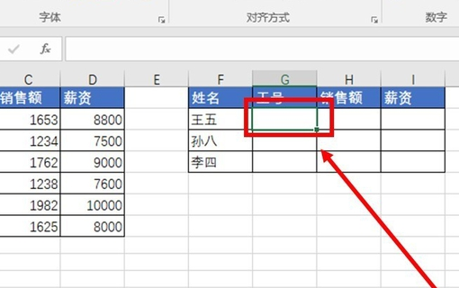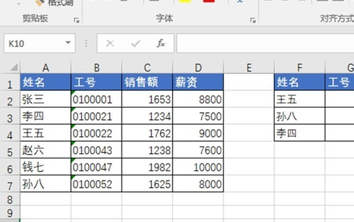 1、首先,打开需要查找的数据表,如图。我们需要将表1中的工号、业绩、薪酬匹配到表2中。