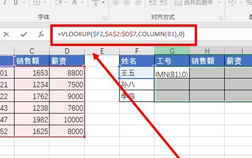 6、在编辑栏输入刚刚的函数【=VLOOKUP($F2,$A$2:$D$7,COLUMN(B1),0)】。