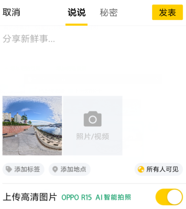 3.插入图片,如果是全景图片图片左上角会有一个球形的标志,发布成功图片会有一个360的标志,点击图片手机移动查看全景