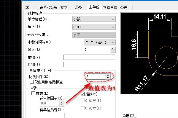 5、进入“主单位”页面后,找到比例因子,把它的数值修改为“1”。