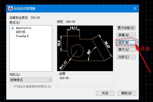 3、在标注样式管理器的右边一排中寻找“修改”,找到后点击“修改”进入修改页面。