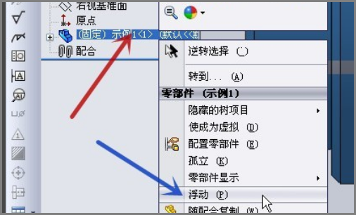 3、要想改变此固定状态,需在左侧的状态栏中,对着零件名称单击鼠标右键,在弹出菜单中点击“浮动”。