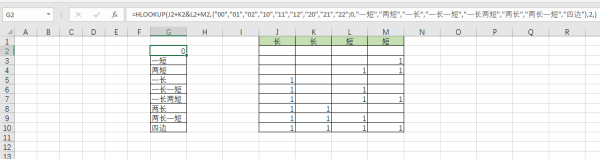 =HLOOKUP(J2+K2&L2+M2,{"00","01","02","10","11","12","20","21","22";0,"一短","两短","一长","一长一短","一长两短","两长","两长一短","四边"},2,)